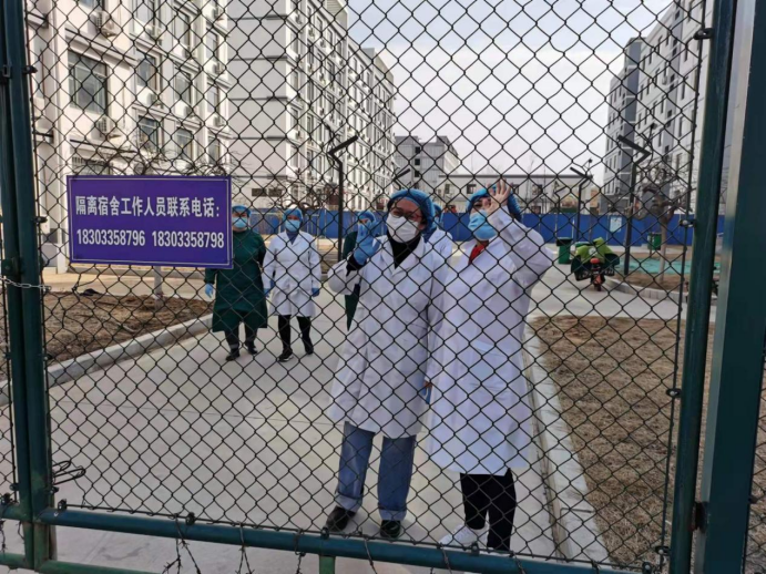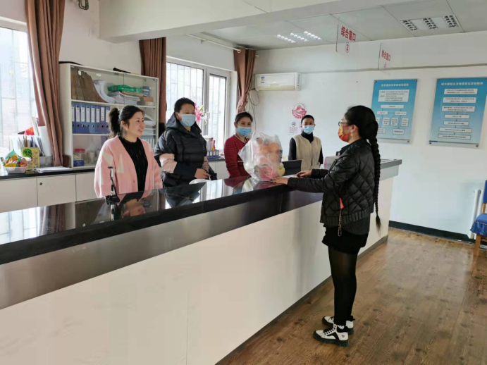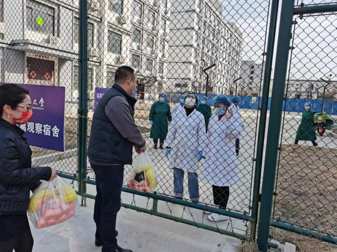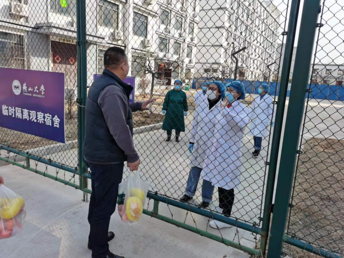 3月8日上午,后勤服务中心工会主席贾晓光一行到西校区十三组团隔离观察宿舍看望慰问了在岗的医护人员,并到居委会慰问抗疫人员,并向她们致以节日的祝贺和诚挚的慰问。