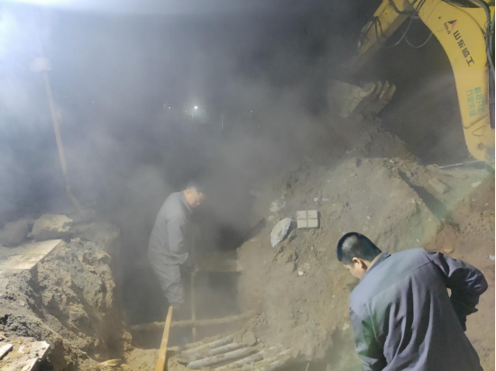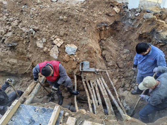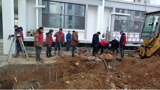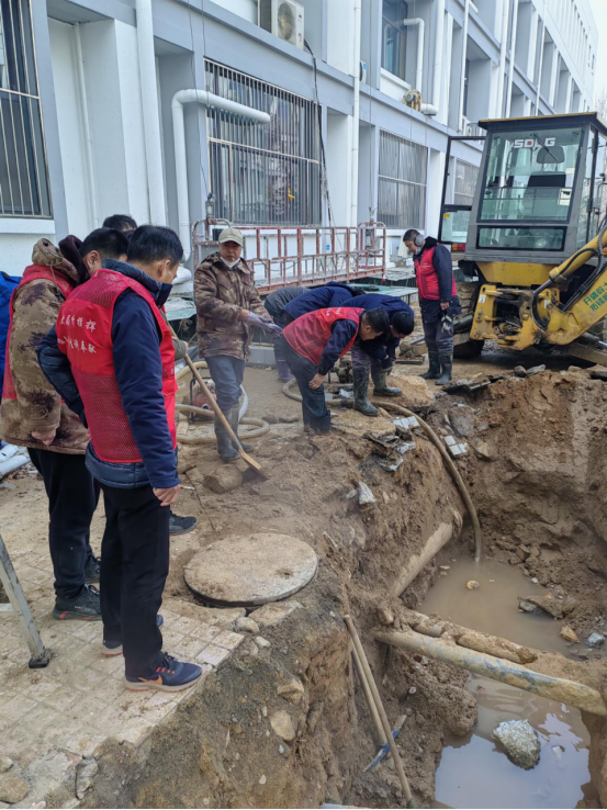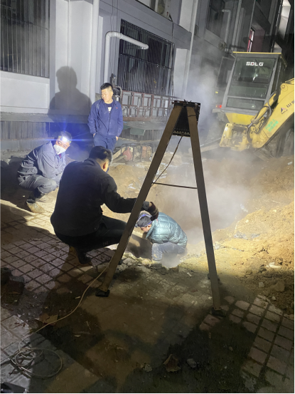 3月6日下午5点,西校区水暖工在巡视过程中发现材料馆B楼东北侧地面有大量积水,通过地下管网图和材料馆换热站管道压力判断,为该处供热一次网管道漏水,将影响材料馆,电气馆和西区第一至第四教学楼的正常供暖。经过二十多个小时的连续作业,于3月7日下午3:40分将漏水管道更换完毕,恢复正常供暖。