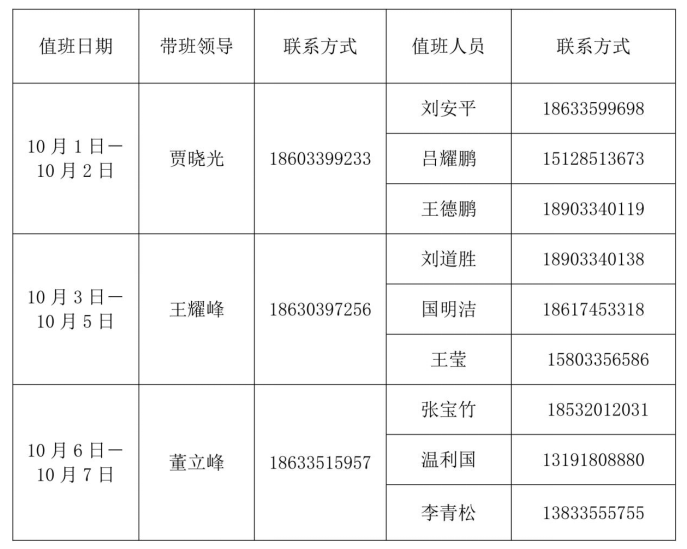 一、国庆节假期安排值班,具体如下